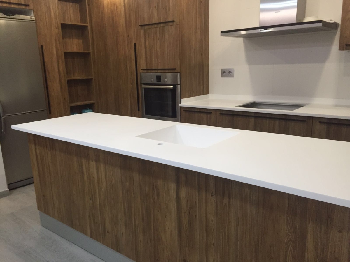 En hogar, el criterio cambia ligeramente: se valora mucho la estabilidad estética y la facilidad de limpieza, pero el desgaste suele ser menos agresivo que en retail. Por eso, materiales como laminado o Solid Surface suelen rendir muy bien en cocinas y baños, mientras que la madera aporta una capa de calidez cuando el diseño y el acabado están bien resueltos.